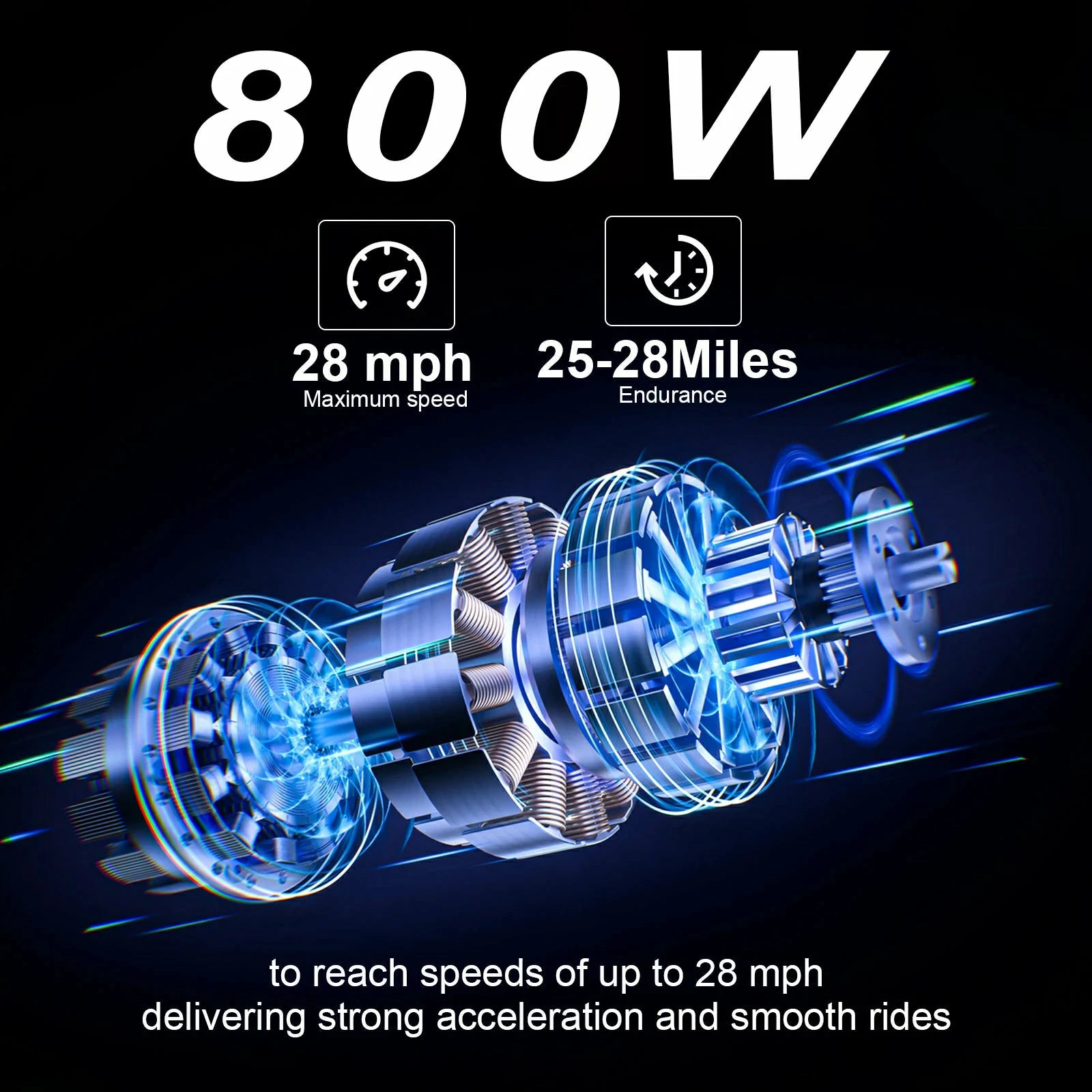 The 800W motor powers the scooter to reach speeds of up to 28 mph, delivering strong acceleration and smooth rides, whether you're navigating city streets or tackling rough terrains.