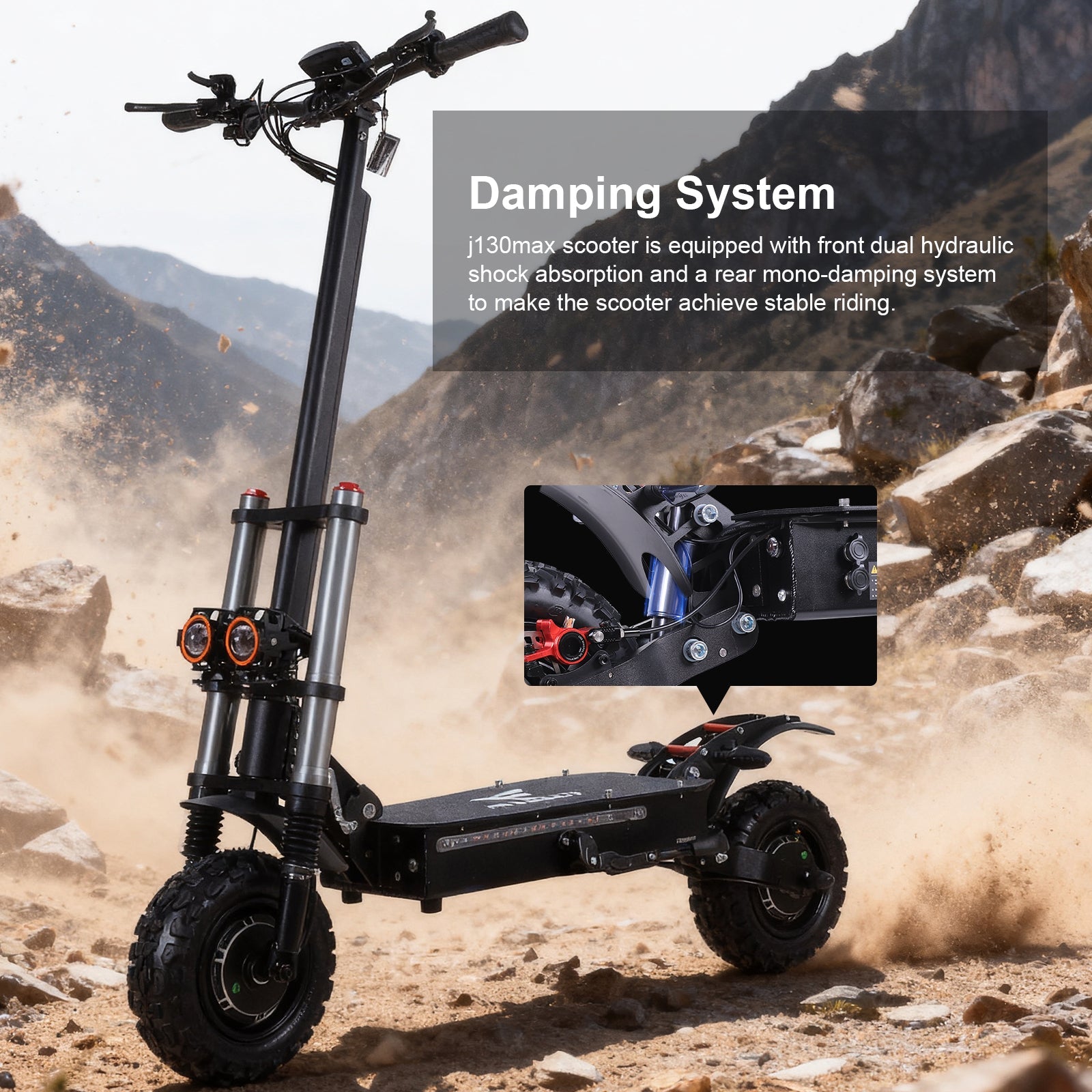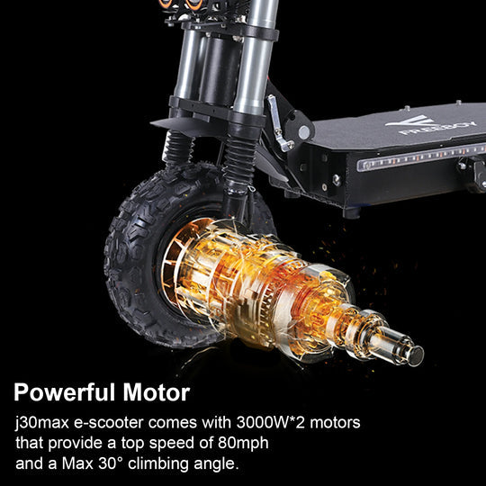 30MAX delivers unparalleled power with dual 3000W motors, reaching speeds up to 50 mph. With a 35° climbing angle, it conquers even the steepest hills effortlessly. Its 55-mile range and 11” off-road tires ensure smooth rides, while dual hydraulic shock absorbers handle any terrain with ease. Built with IPX5 waterproof protection, J30MAX is ready to take on the elements, no matter where your adventure leads. A perfect blend of speed, power, and comfort for the ultimate ride.