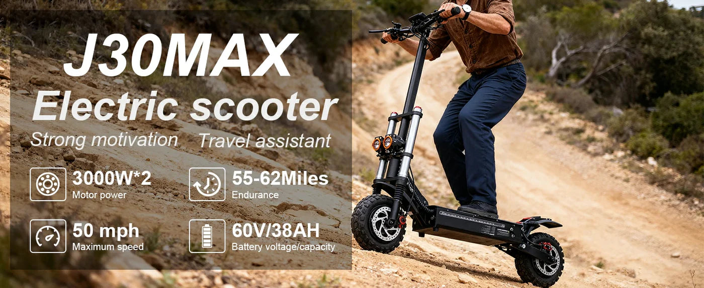 The J30MAX electric scooter features dual motors, a top speed of 55 mph, a 40% climbing angle, and a range of up to 50 miles under optimal conditions, delivering unmatched power and performance.